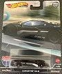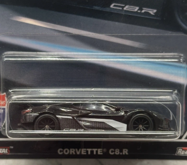 The car is black in color and decorated with white stripes and grey acces. "C8.R" is displayed on sides of the car. It features head and taillight details, tinted windows, a black interior and black metal base. The car comes with Real Rider wheels with 10-spoke rims.