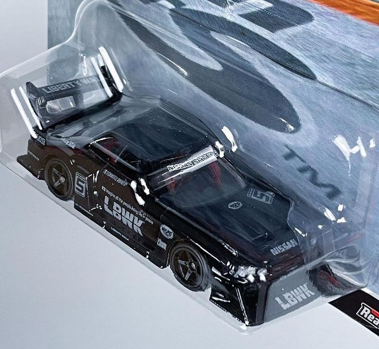 The car is black in color and decorated with Liberty Walk and other sponsor logos. "Nissan Skyline" is displayed on the top of the windshield. It features head and taillight details, clear windows, a black interior and black metal base. The car comes with Real Rider wheels with black modern 5-spoke rims.