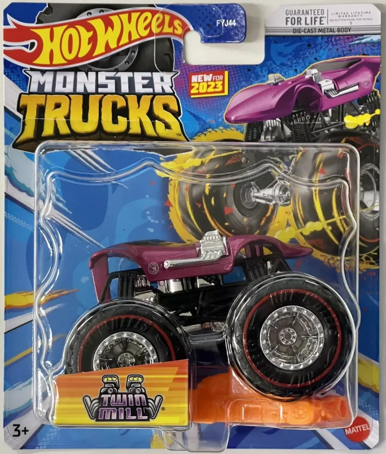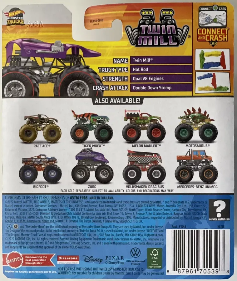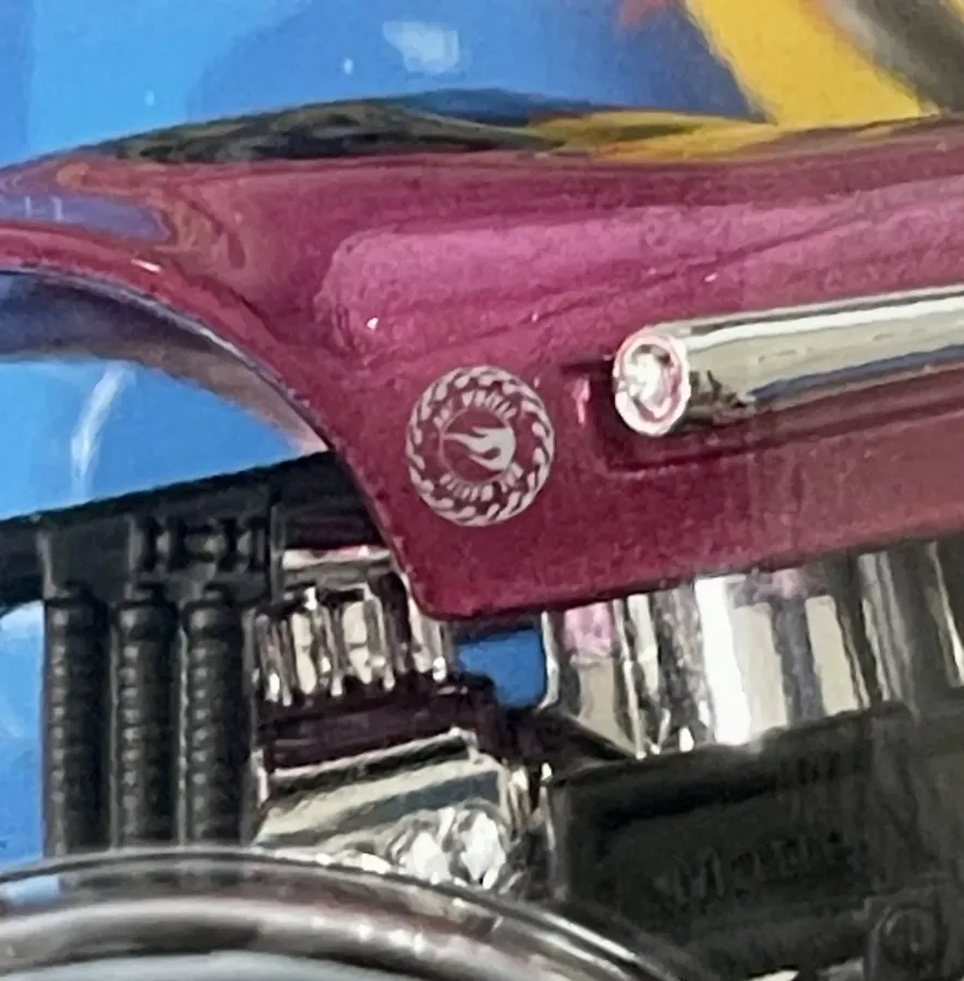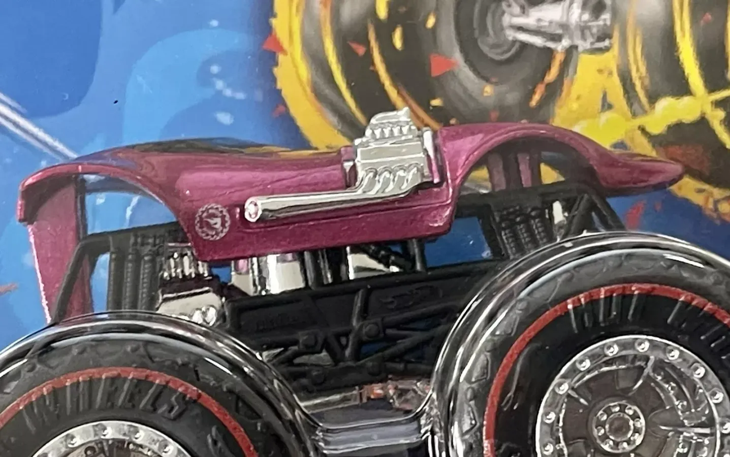 Identification: The car is purple in color with a Hot Wheels logo decorating the rear. Featured is the dark tinted windows, a black cage and redline wheels with chrome rims. Identifying the Treasure Hunt: A circle & flame inside a knobby tire, can be found on the sides. |