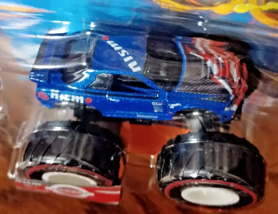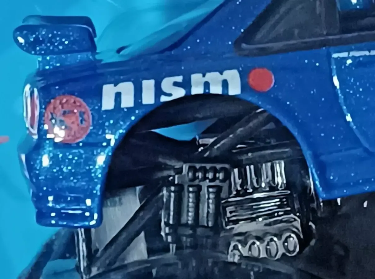 Identification: The car is is blue with red and white graphics and carbon fiber stripes on the hood. It has a Nismo livery decorated with a variety of sponsor logos. Featured is the dark tinted windows, a black cage and redline wheels with chrome rims. Identifying the Treasure Hunt: A circle & flame inside a knobby tire, can be found on the sides. |