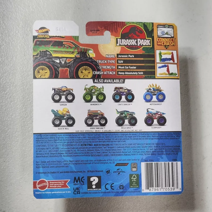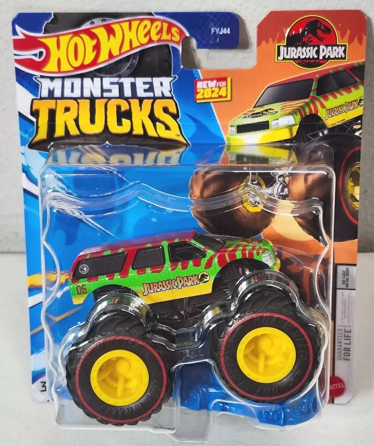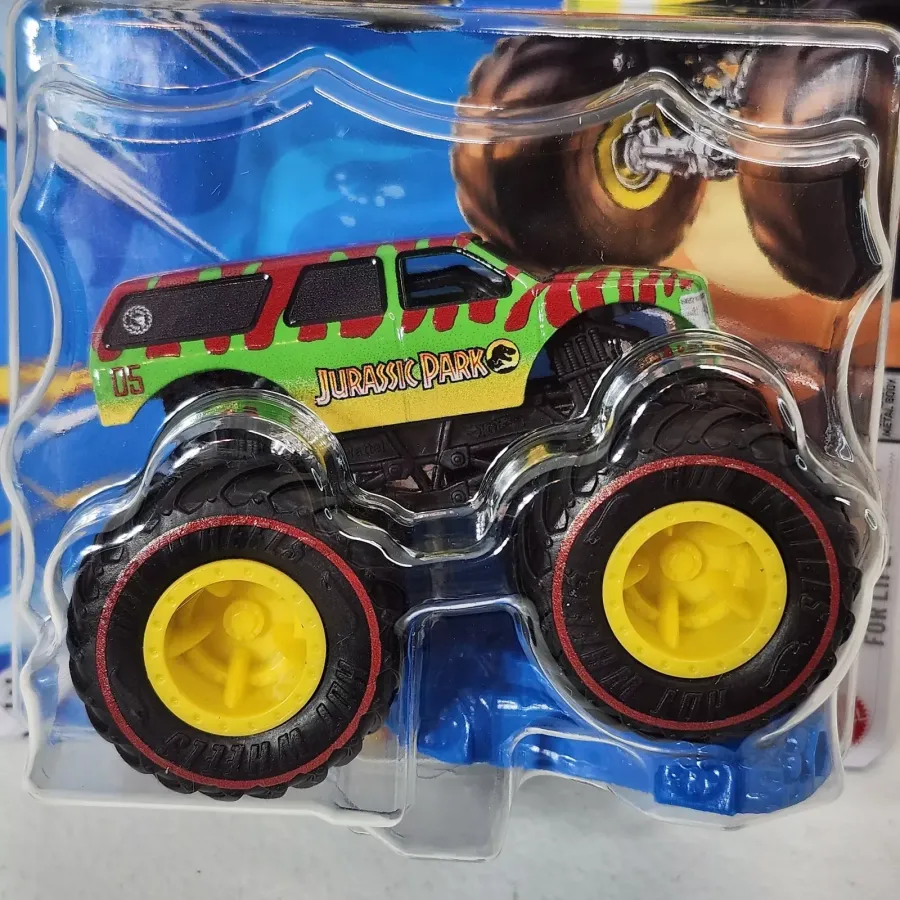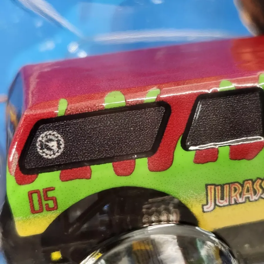 Identification: The vehicle is green, yellow and red in color with the Jurassic Park livery and number "05" on the car. The car features dark tinted window, a black cage and redline wheels with yellow rims. Identifying the Treasure Hunt: A circle & flame can be found inside a knobby tire located on the side window towards the rear of the car. |