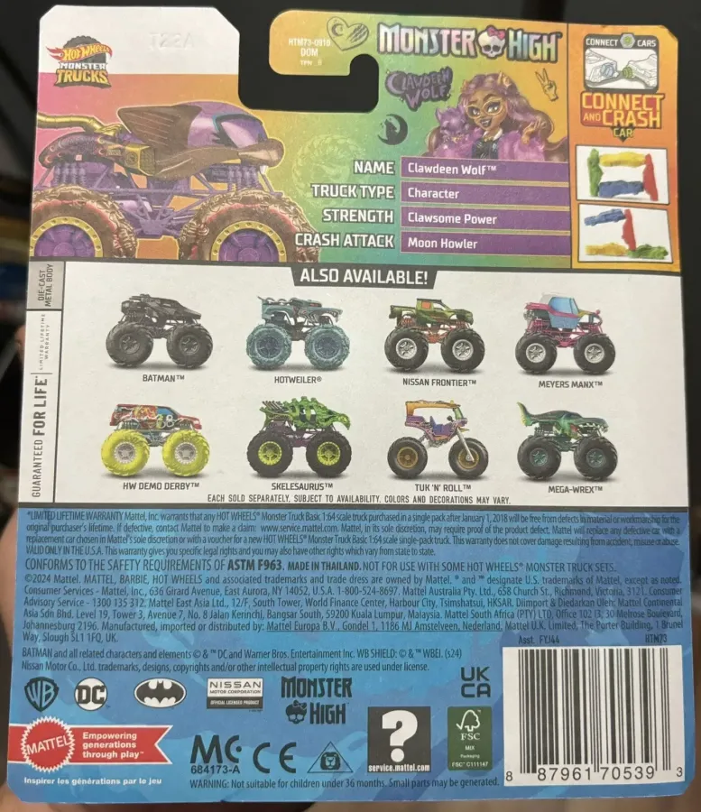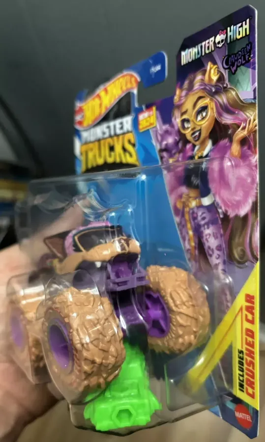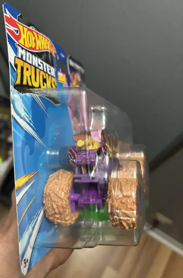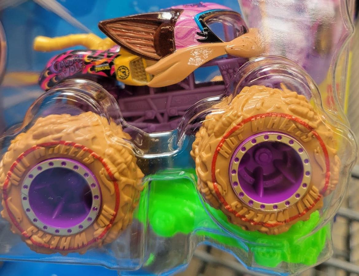 The truck is purple in color and decorated with a golden exhaust and pink wolf helmet and other graphics. It comes with tan wheels with a red line around it and purple rims.