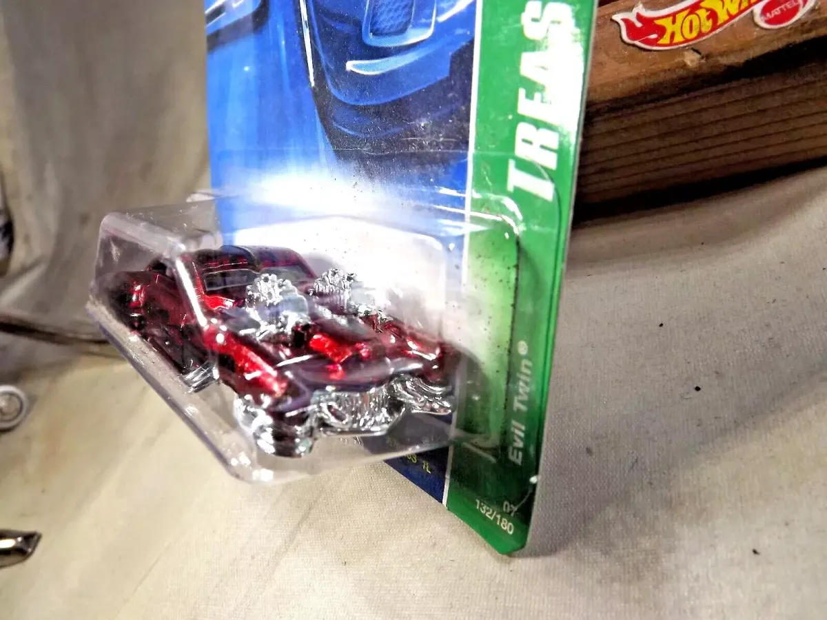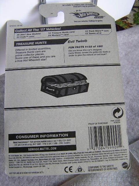 PART NUMBER: K7623S HOT WHEELS #: 132 TYPE: Mainline NAME: Evil Twin COLOR: Spectraflame Red SERIES NAME: Trea$ure Hunt$ SERIES #: 12 |