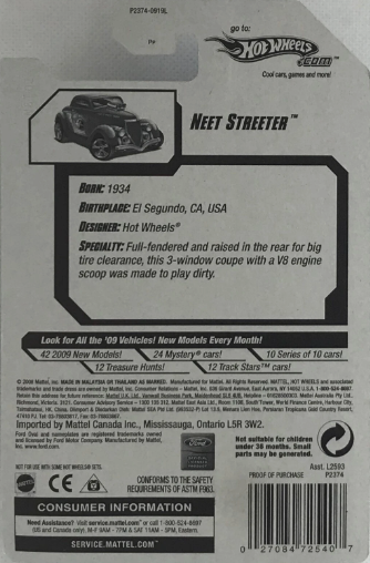 PART NUMBER: P2374 HOT WHEELS #: 54 TYPE: Mainline NAME: Neet Streeter COLOR: Spectraflame Olive Green SERIES NAME: Trea$ure Hunt$ SERIES #: 12 |