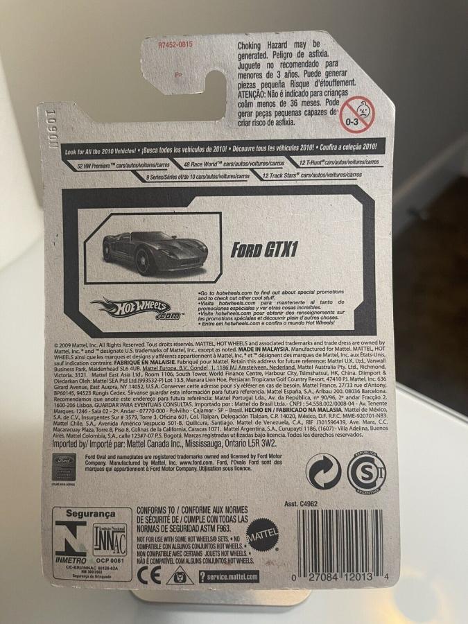 Identification: The car is Spectraflame blue in color. The car is decorated with “TH” and “FORD GTX1” on the sides as well as light blue and silver stripes. It features a clear windshield, a chrome interior and a black plastic base. The car comes with Real Rider 5-spoke mag-style wheels.
