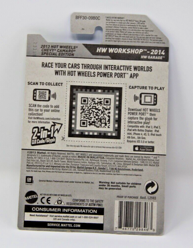 The car is Spectraflame red in color and decorated with black & white stripes on the sides and top. The sides also display “CAMARO” and the Hot Wheels logo. It features tinted windows, a black interior and a black plastic base. The car comes with Real Rider 5-spoke mag-style wheels with black spokes and red rims.