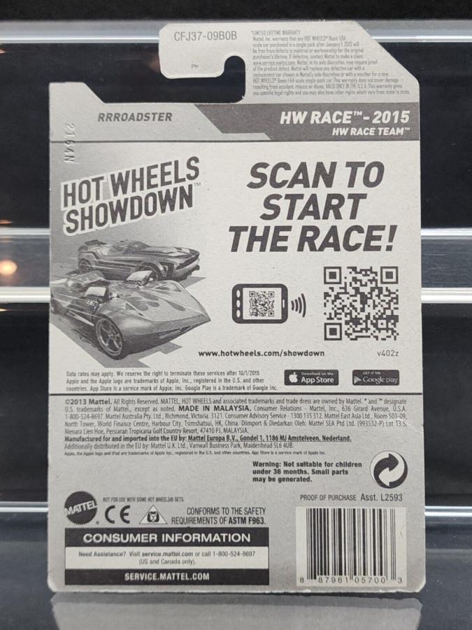 PART NUMBER: CFJ37 HOT WHEELS #: 129 TYPE: Mainline NAME: RRRoadster COLOR: Spectraflame Blue SERIES NAME: HW Race - Race Team SERIES #: 4 DATE CODE: CASE: B |