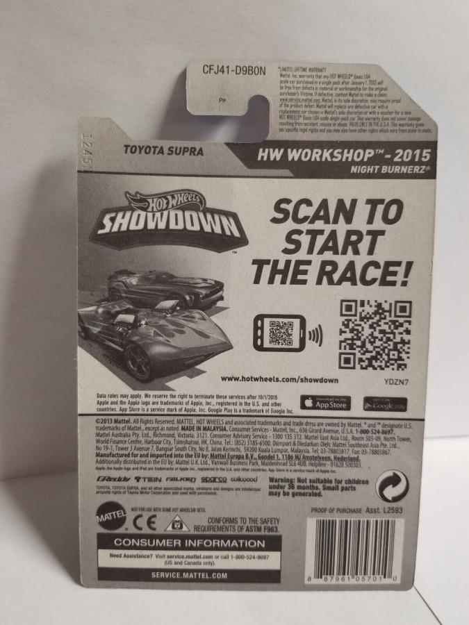 PART NUMBER: CFJ41 HOT WHEELS #: 201 TYPE: Mainline NAME: Toyota Supra COLOR: Spectraflame Red SERIES NAME: HW Workshop - NightBurnerz SERIES #: 6 DATE CODE: CASE: N |