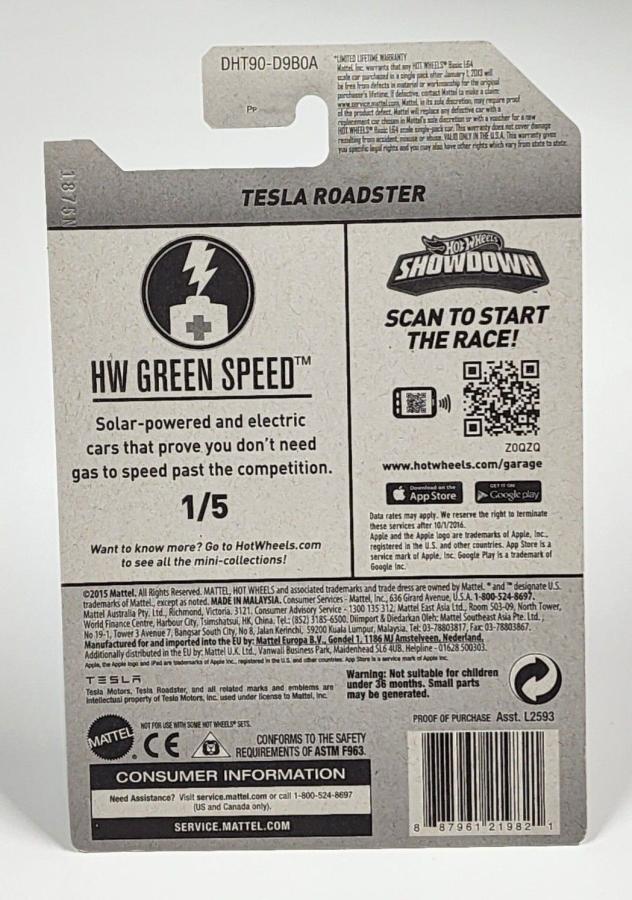 Series & Number: It is also 1/5 in the HW Green Speed series. Case Details: This vehicle can be found in mix “A” of 2016 Hot Wheels mainline cases. Identification: The car is Spectraflame red in color and decorated with black & white graphics on the top of the hood and trunk of the car. The back of the car displays “Tesla” and the Hot Wheels logo on top. It features a clear windshiels, a black interior and a black plastic base. It comes with Real Rider 5-Spoke Mag-Style wheels. Identifying the Treasure Hunt: “TH” can be found on the back of the car.