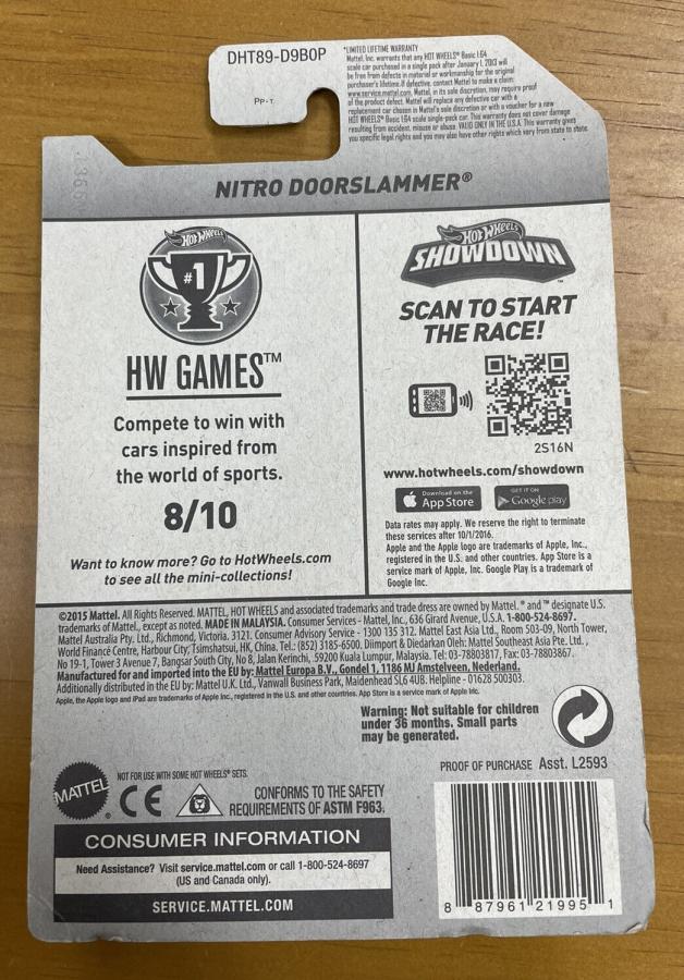Series & Number: It is also 8/10 in the HW Games series. Case Details: This vehicle can be found in mix “P” of 2016 Hot Wheels mainline cases. Identification: The car is Spectraflame blue in color and decorated with red circle outlines, red oval stripes, and a wide red stripe with double white stripes down the top of the car. The sides feature a swimmer logo, and a gold wheel medal with “2016” and the Hot Wheels logo. Along the rocker panels you will find red & white stripes. It features clear windows, a chrome interior and a white plastic base. It comes with black Real Rider wheels with red rims. Identifying the Treasure Hunt: “TH” can be found on the sides of the car. Fact Sheet: YEAR: 2016 PART NUMBER: DHT89 HOT WHEELS #: 238 TYPE: Mainline NAME: Nitro Doorslammer COLOR: Spectraflame Black SERIES NAME: HW Games SERIES #: 8 DATE CODE: CASE: P |
