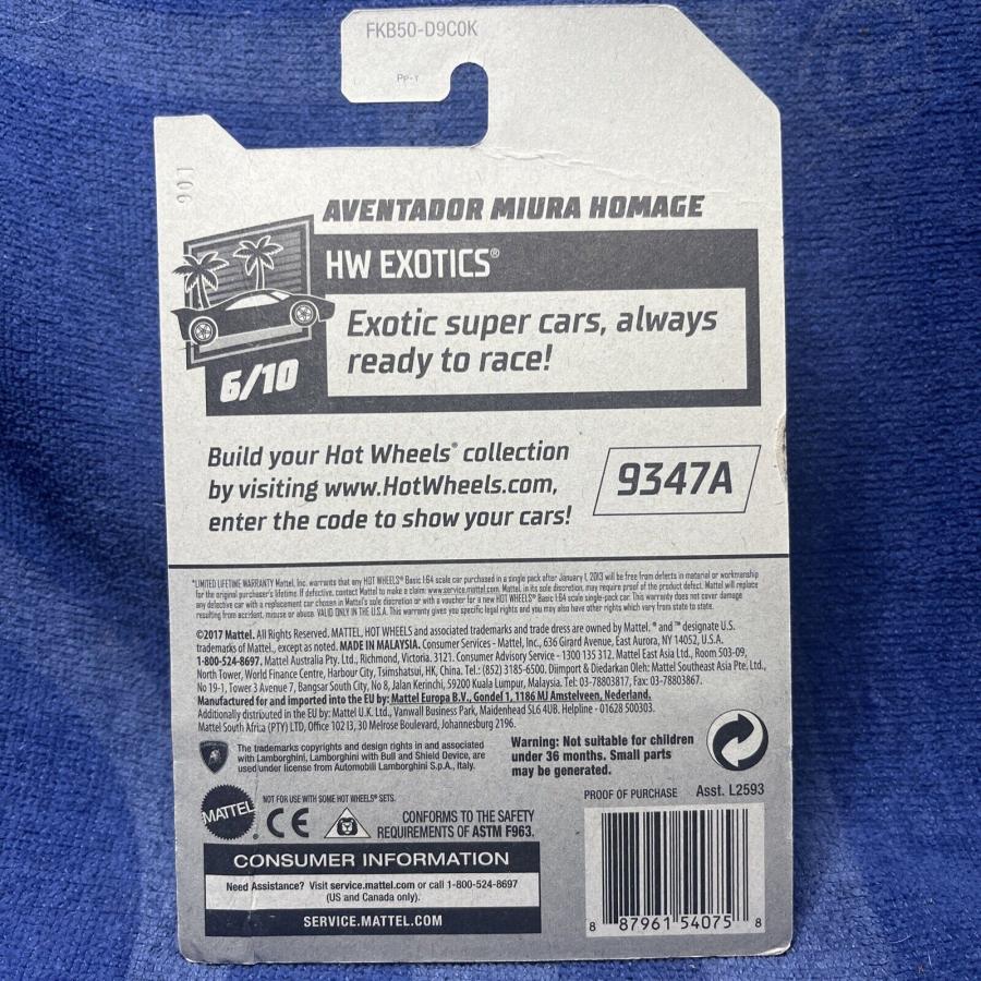 PART NUMBER: FKB50 HOT WHEELS #: No # TYPE: Mainline NAME: Aventador Miura Homage COLOR: Spectraflame Red SERIES NAME: HW Exotics SERIES #: 6 DATE CODE: CASE: K |