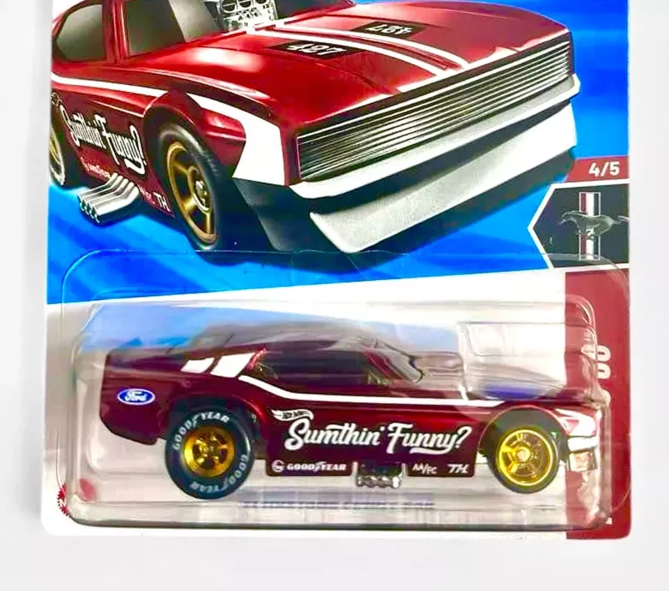 Series & Number: It is also 4/5 in the Mustang 60 series. Case Details: This vehicle can be found in mix “H” of 2025 Hot Wheels mainline cases. Identification: It is Spectraflame red with a livery decorated with “Sumthin’ Funny?” and logos for Ford, Goodyear, and Hot Wheels. Features include blue-tinted windows, a chrome plastic Malaysia base, and Real Rider wheels Identifying the Treasure Hunt: The "TH" can be found on the sides.