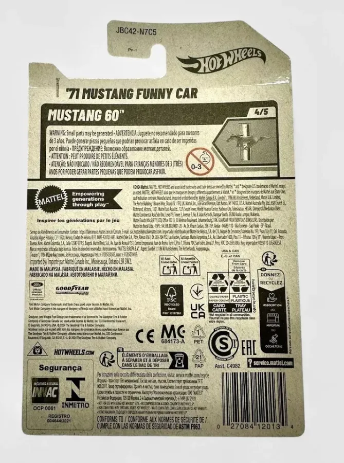 PART NUMBER: JBC42 HOT WHEELS #: 175 TYPE: Mainline NAME: '71 Mustang Funny Car COLOR: Spectraflame Red SERIES NAME: Mustang 60 SERIES #: 4 DATE CODE |