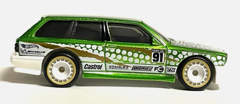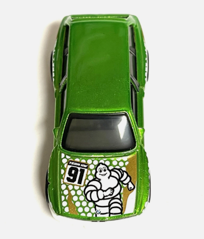 Series & Number: It is also 5/5 in the HW Wagons series. Case Details: This vehicle can be found in mix “P” of 2025 Hot Wheels mainline cases. Identification: The vehicle is a Spectraflame green decorated car, with a Michelin Man livery with spots, jagged stripes, and sponsor logos. The features include tinted windows, a gray interior, a green plastic Malaysia base and it sports Real Rider wheels. Identifying the Treasure Hunt: "TH" can be found on the front fender near the door of the vehicle.