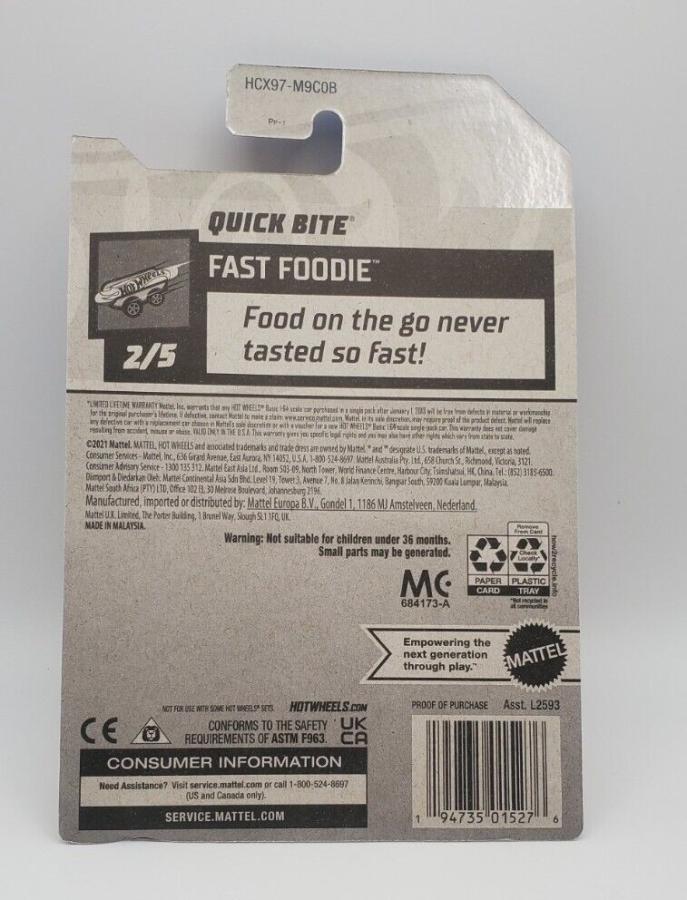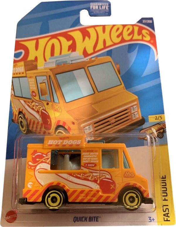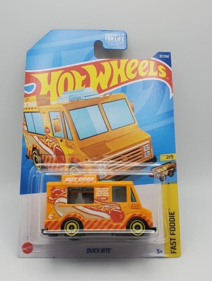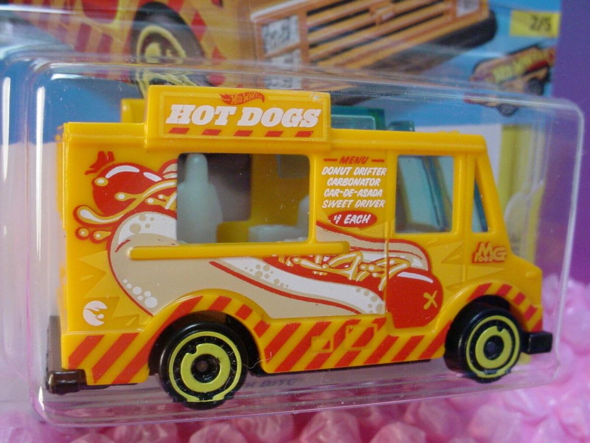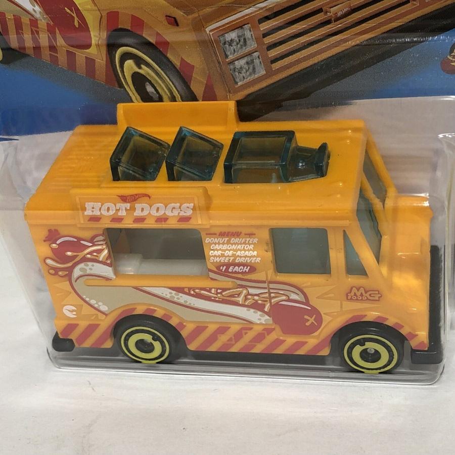 The car is orange in color. The sides are decorated with a large hotdog graphic along with a menu that includes the donut drifter, carbonator, car-de-asada, and sweet driver. “Hot Dogs” and the Hot Wheels logo are found on the billboards. It features blue-tinted windows, a white interior and a black plastic base.