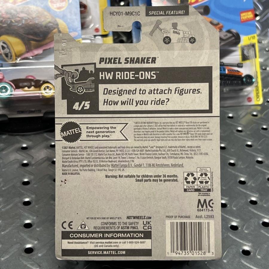 PART NUMBER: HCY01 HOT WHEELS #: 66 TYPE: Mainline NAME: Pixel Shaker COLOR: Green SERIES NAME: HW Ride-Ons SERIES #: 4 DATE CODE: CASE: C |