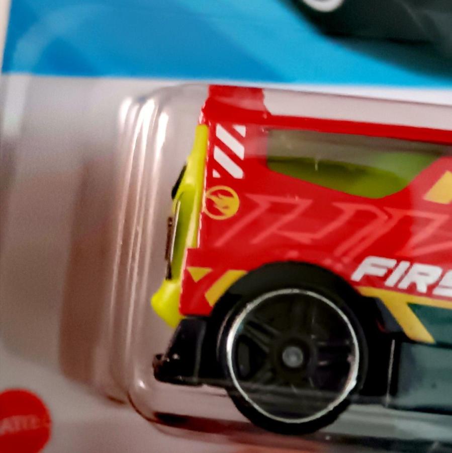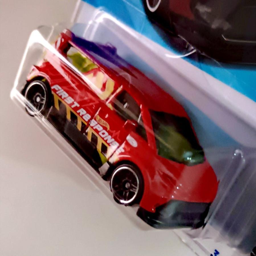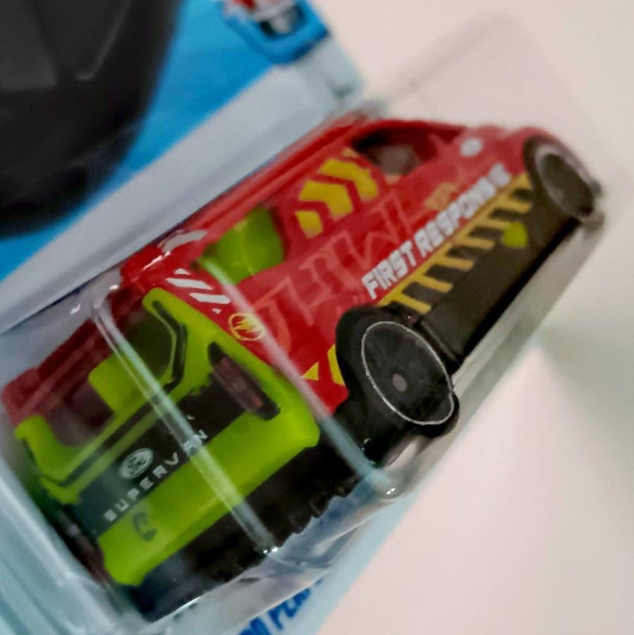 Features include tinted windows, a yellow interior, and a black plastic Malaysia base. It rides PR5 wheels with black rims. The red van is decorated with “HW First Response” along with a variety of stripes and graphics