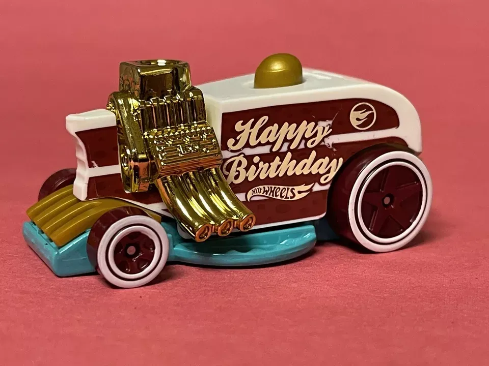 Series & Number: It is also 5/10 in the HW Celebration Racers. Case Details: This vehicle can be found in mix “G” of 2025 Hot Wheels mainline cases. Identification: The vehicle is painted a white frame with a "HAPPY BIRTHDAY" decal and the Hot Wheels logo on the side of the vehicle. The body is a red-brown cake with white stripes of icing through and a white top icing, including a blue base and a golden fork at the front. Identifying the Treasure Hunt: The low production symbol can be found on the top layer of the cake slices near the rear of the car.