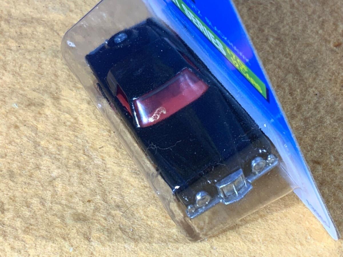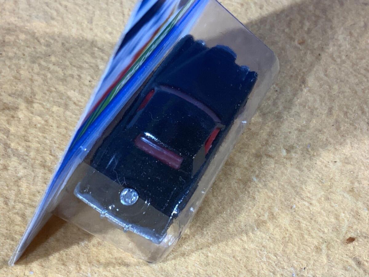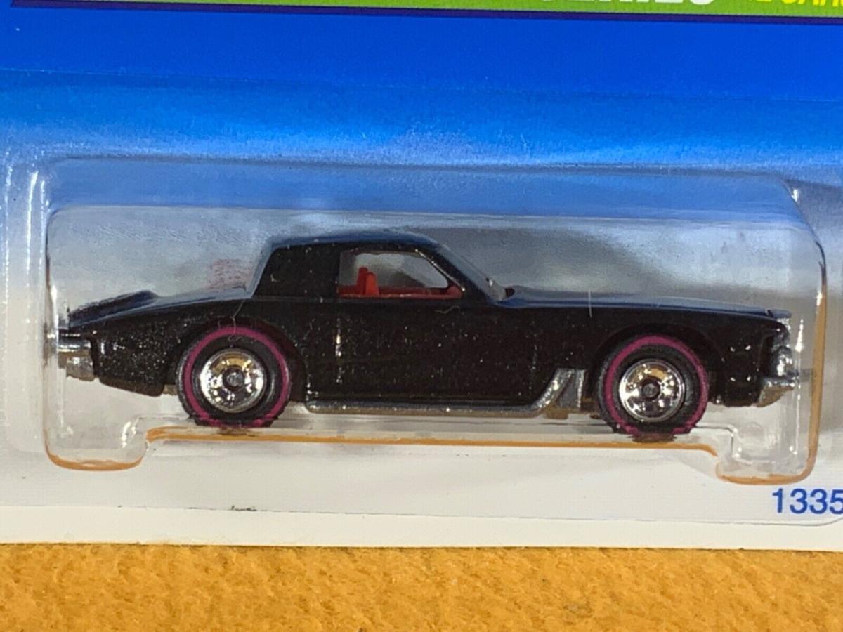 The car is black in color and is decorated with a Hot Wheels logo on the windshield. It features clear windows, a red interior and an unpainted metal base. It has Real Rider wheels with deep dish rims and redline tires.