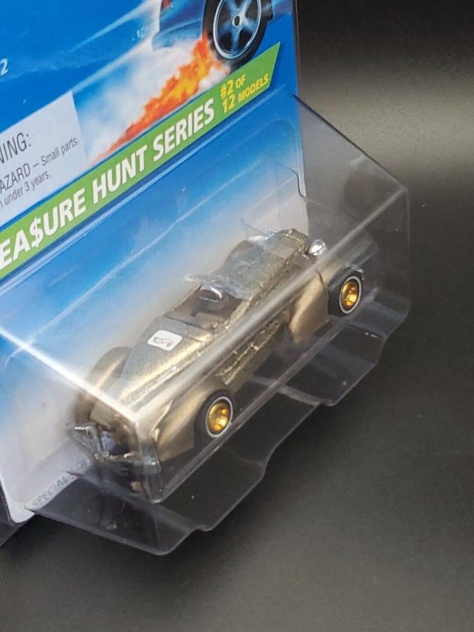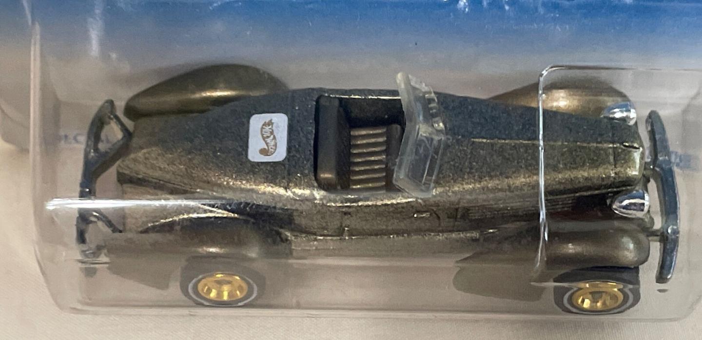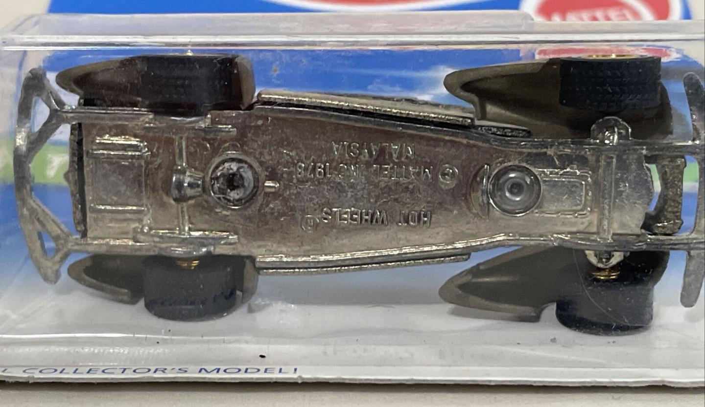 The car is black and metalflake in color. The Hot Wheels logo is found inside a white rectangle behind the cockpit. It features a clear windshield, a dark gold interior and an unpainted metal base. The car has Real Rider wheels with Deep Dish rims and white line tires.