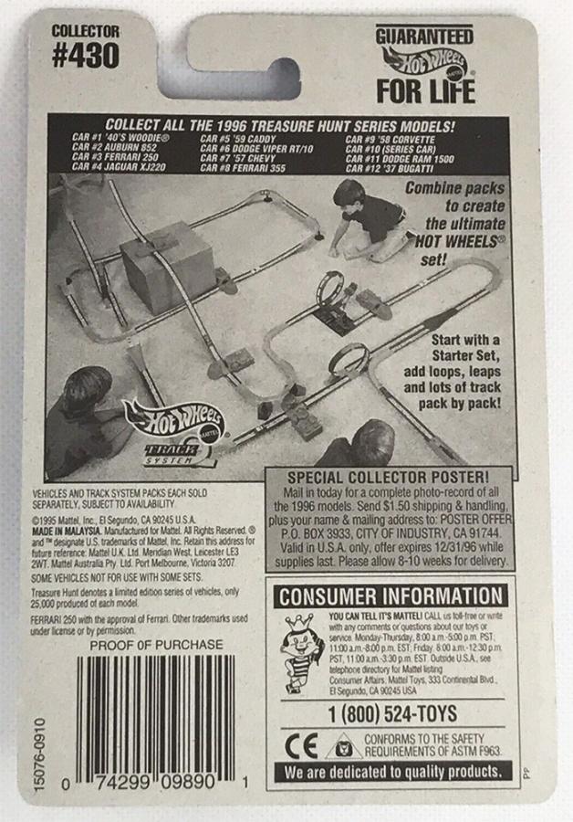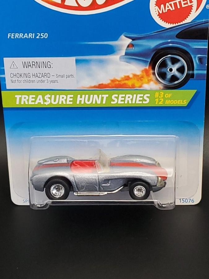 PART NUMBER: 15076 HOT WHEELS #: 430 TYPE: Mainline NAME: Ferrari 250 COLOR: Metallic Gray SERIES NAME: Trea$ure Hunt Series SERIES #: 3 |