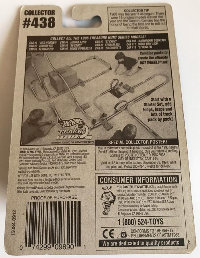 Collector Number: It has collector number 438. Identification: The car is Metalflake red in color and decorated with chrome accents. The gold Hot Wheels logo is found inside a white rectangle on the tailgate. It features an clear windows, a grey interior and a grey plastic base. The car has Real Rider wheels with Deep Dish rims.
