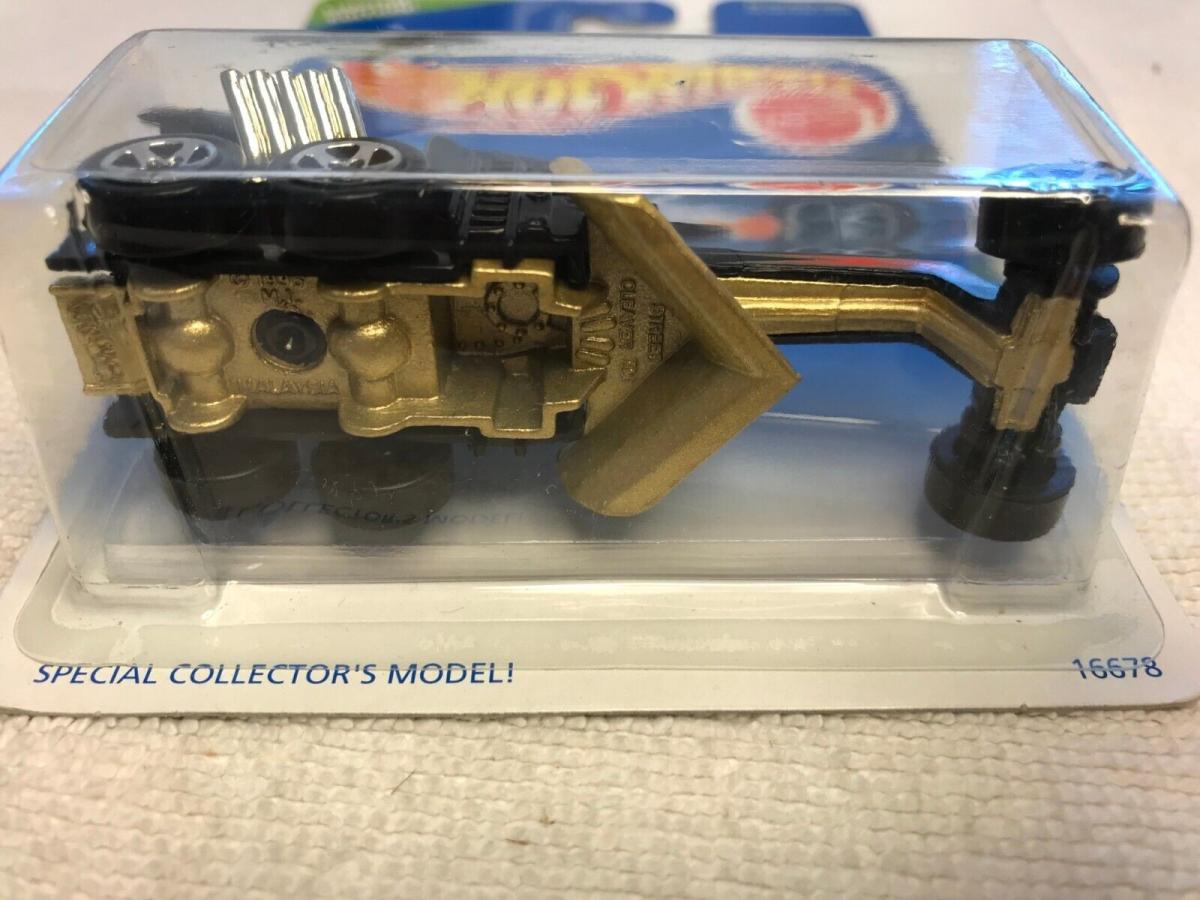 Collector Number: It has collector number 581. Identification: The car is black in color and decorated with red and gold graphics, as well as a Hot Wheels logo. It features a gold motor, a gold metal base and 5-spoke wheels.