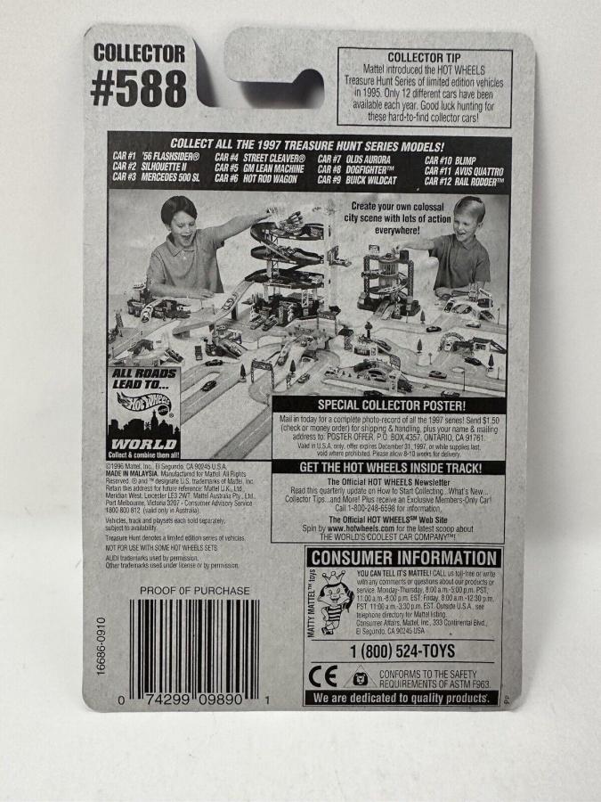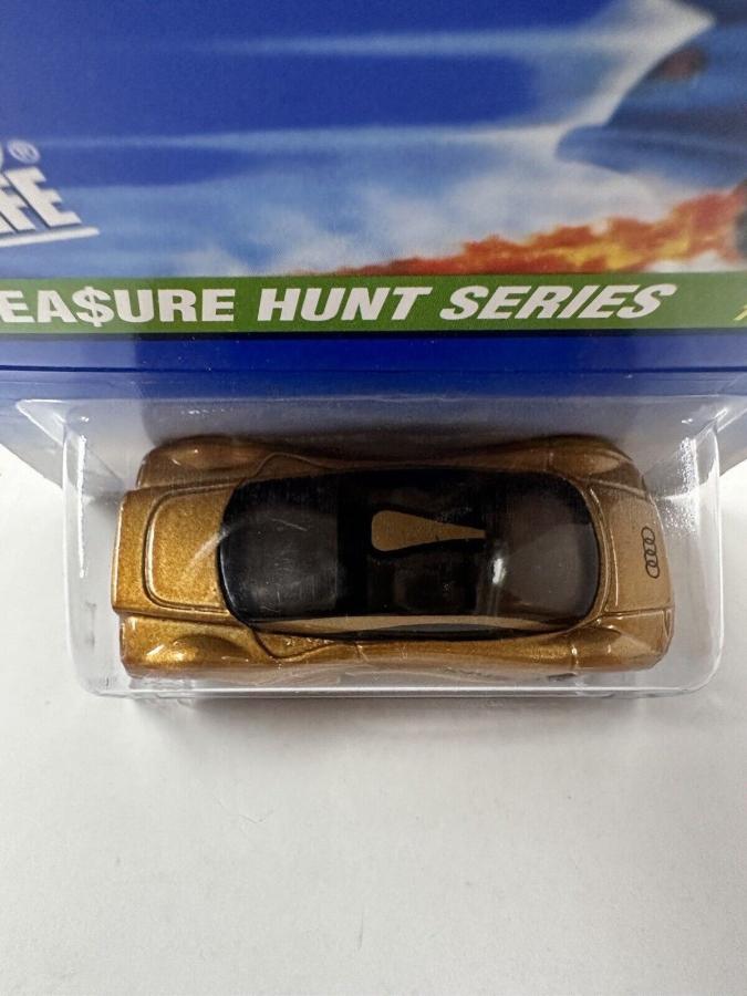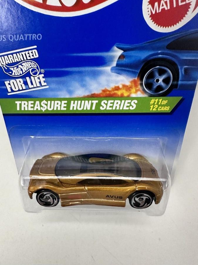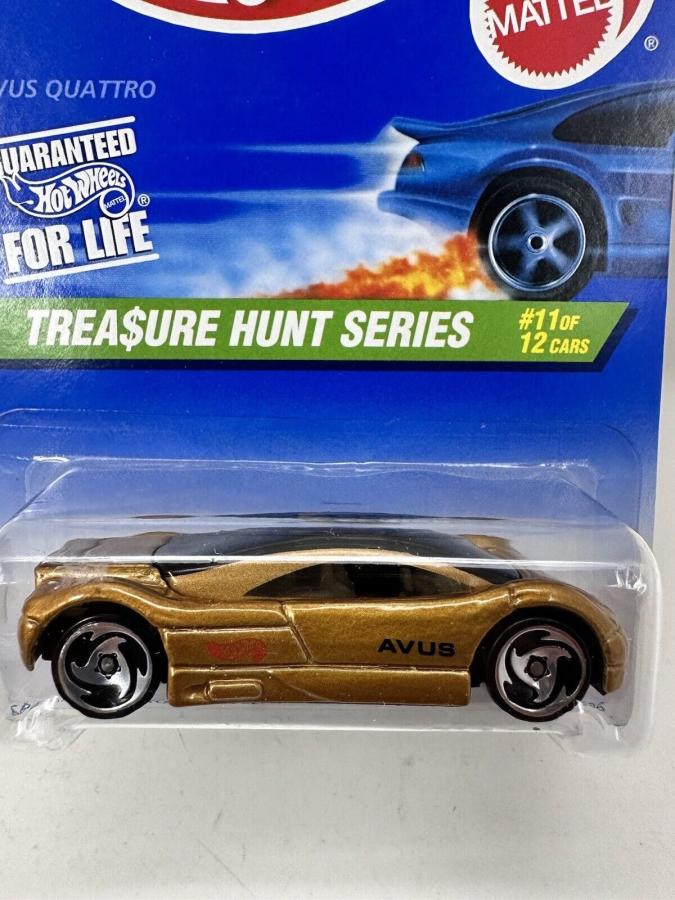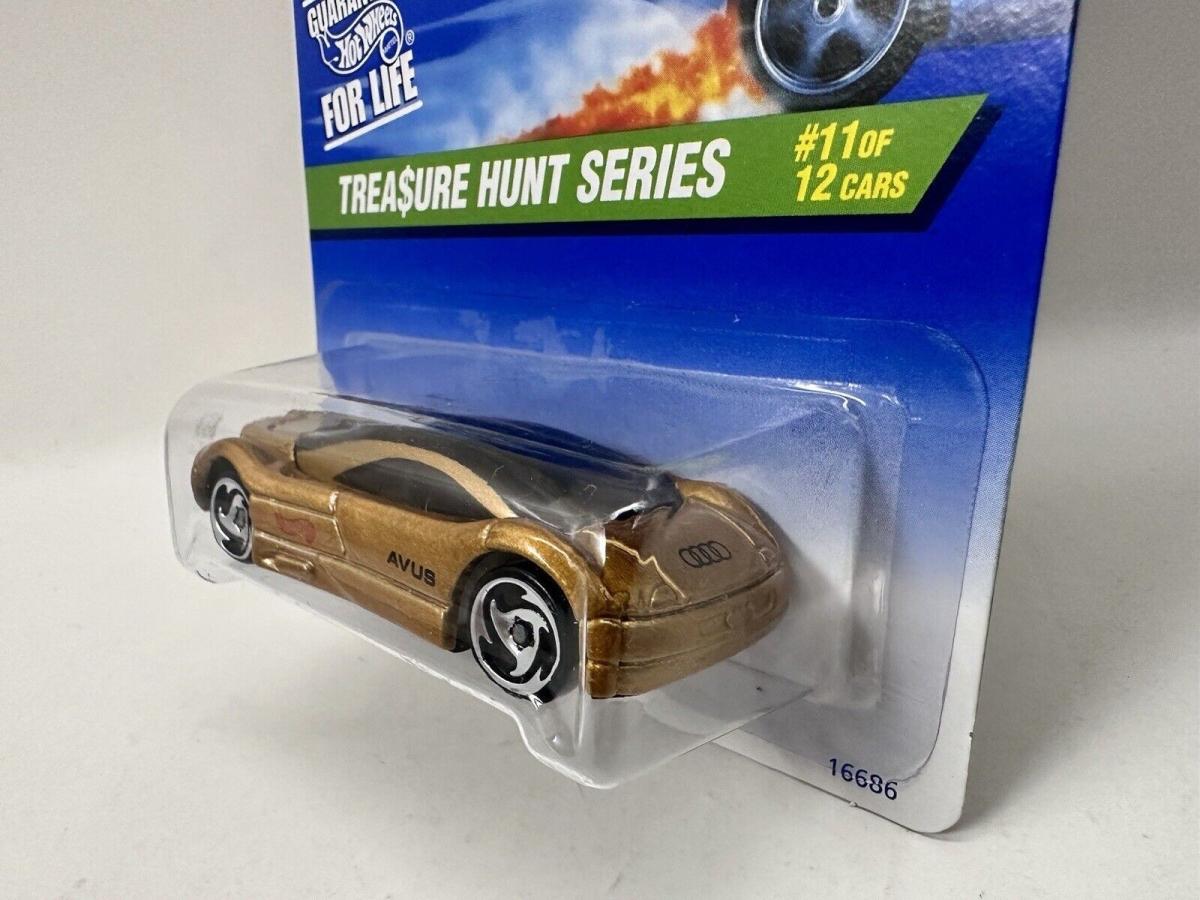 PART NUMBER: 16686 HOT WHEELS #: 588 TYPE: Mainline NAME: Avus Quattro COLOR: Gold metalflake SERIES NAME: Trea$ure Hunt Series SERIES #: 11 |