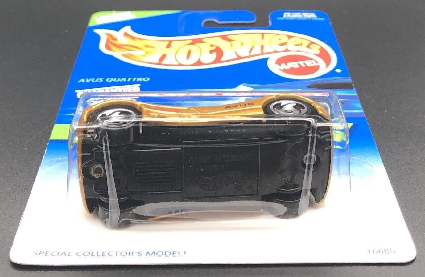 Collector Number: It has collector number 588. Identification: The car is Metalflake gold in color. It comes with an Audi logo on the hood and "AVUS" and a red Hot Wheels logo on the sides of the car. It features tinted windows, a white interior and a black plastic base. The car has Saw Blade wheels.