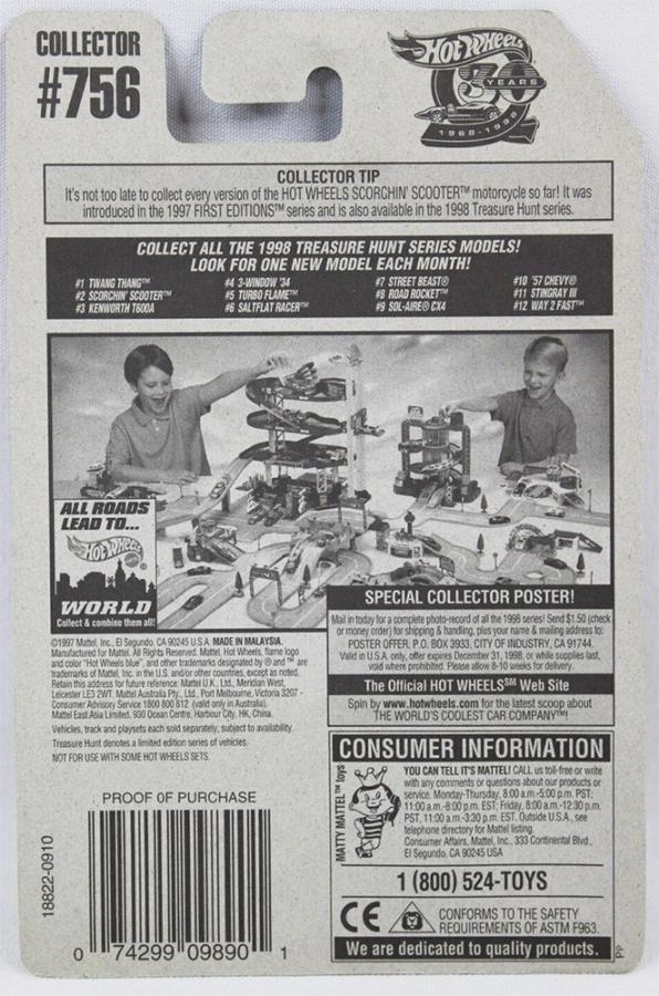 Collector Number: It has collector number 756. Identification: The car is chrome in color and decorated with “TH-98” in black and red on the sides and a black and red Hot Wheels logo on the spoiler. It features a black interior and an unpainted metal base. It comes with 3-spoke wheels.