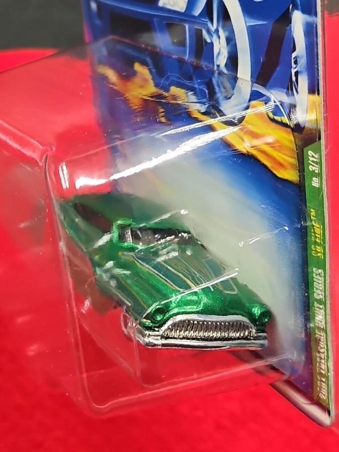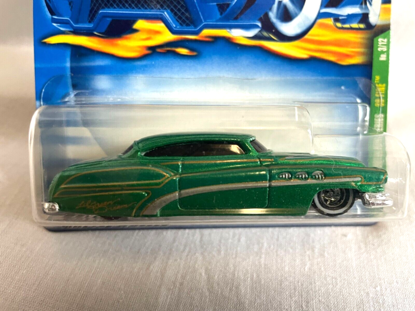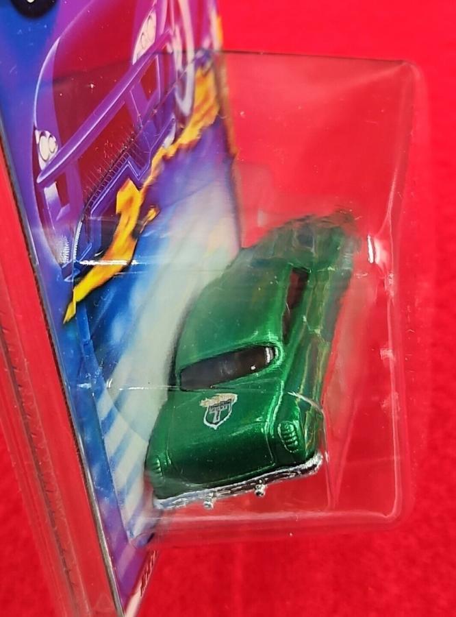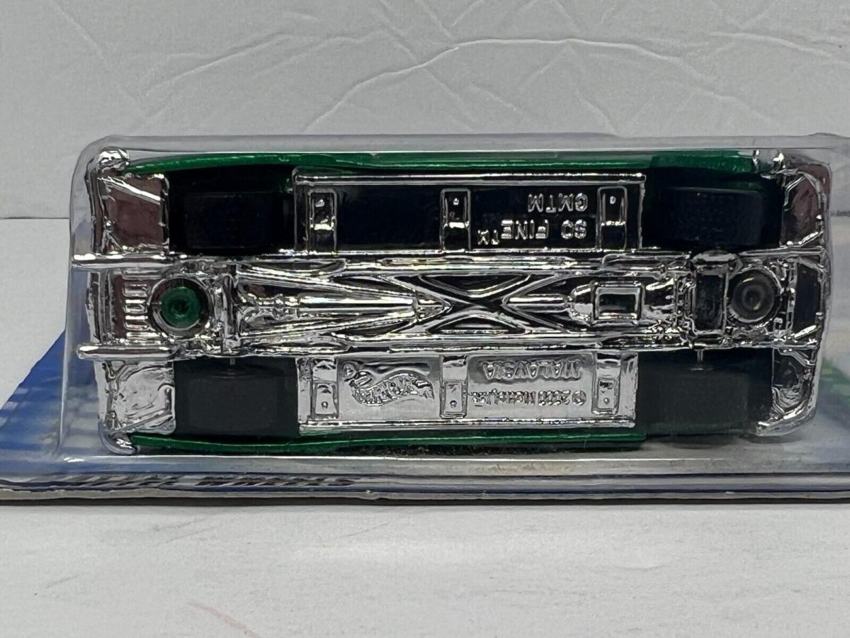 Collector Number: It has collector number 003. Identification: The car is Metalflake green in color. It is decorated with gold and silver stripes. It has “Lil Green Dream” on the sides, and a TH emblem on the trunk. It features dark tinted windows, a black interior and a chrome plastic base. The car has Real Rider wheels with deep dish rims and white line tires.