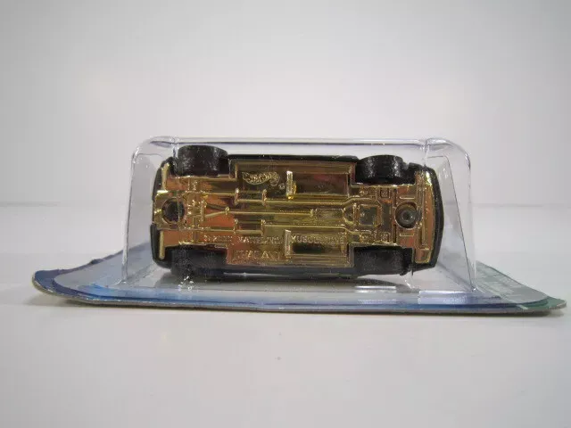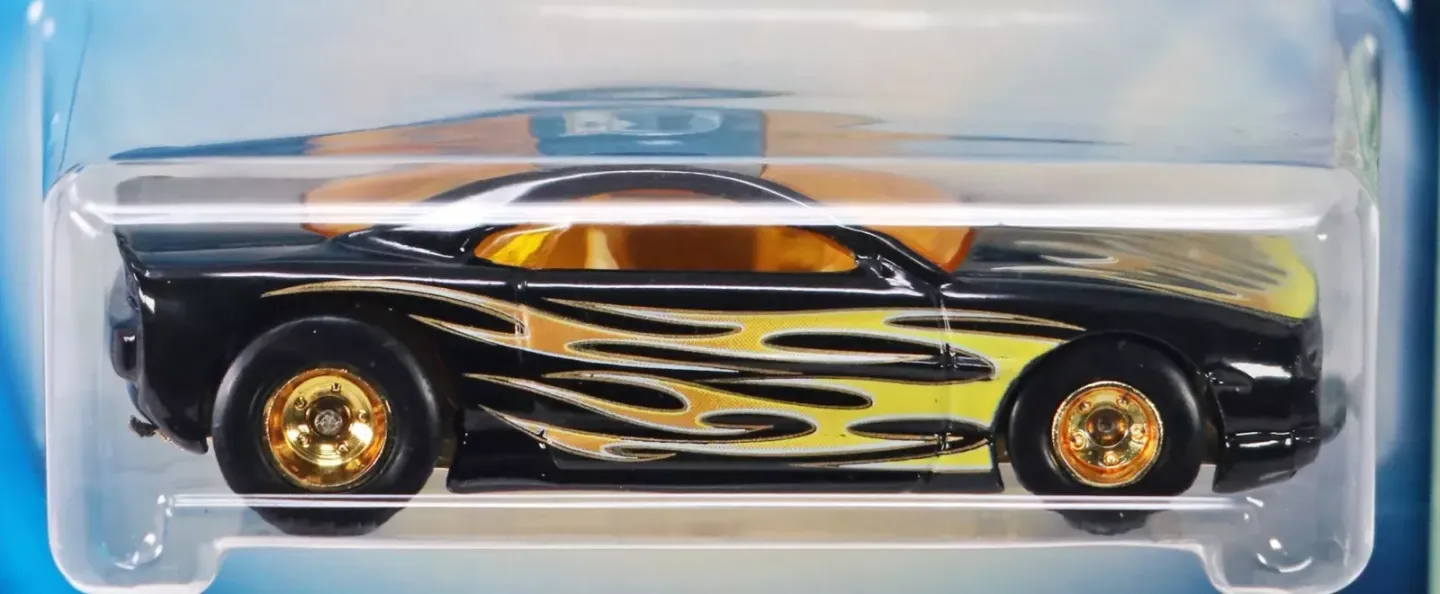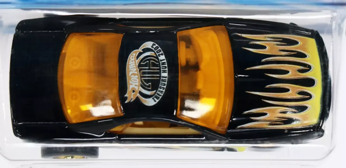 The car is black in color. It is decorated with yellow and gold flames, along with a Treasure Hunt emblem on the roof of the car. It features yellow tinted windows, a beige interior and a gold chrome plastic base. The car has Real Rider wheels with gold chrome deep dish rims.