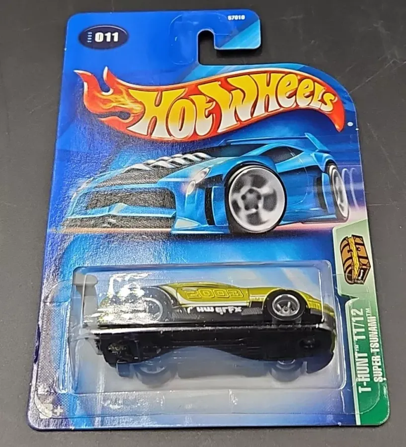 Collector Number: It has collector number 011. Identification: The car is black and Metalflake yellow-green in color. It is decorated with "2003 HW GRFX" on the sides and a Treasure Hunt emblem on the roof of the car. It features tinted windows, a grey interior and a black plastic base. The car has co-molded wheels with grey rims and chrome lips.
