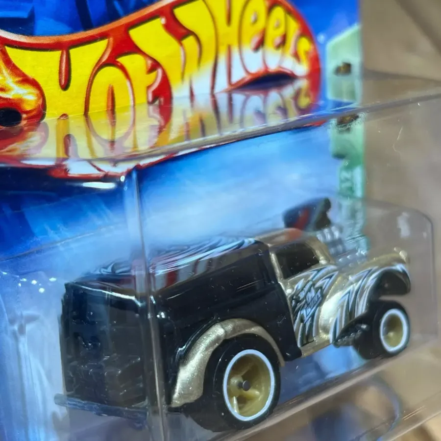 Collector Number: It has collector number 108. Identification: The car is black & Metalflake gold in color. It is decorated with white, black and gold graphics. A Treasure Hunt emblem on the sides of the car. It features tinted windows, a silver interior and an unpainted metal base. There exist two variations for this car's wheels. It could either have gold co-molded wheels or Real Riders wheels with chrome rims and Goodyear tires on the front of the car. See the images below for more information.