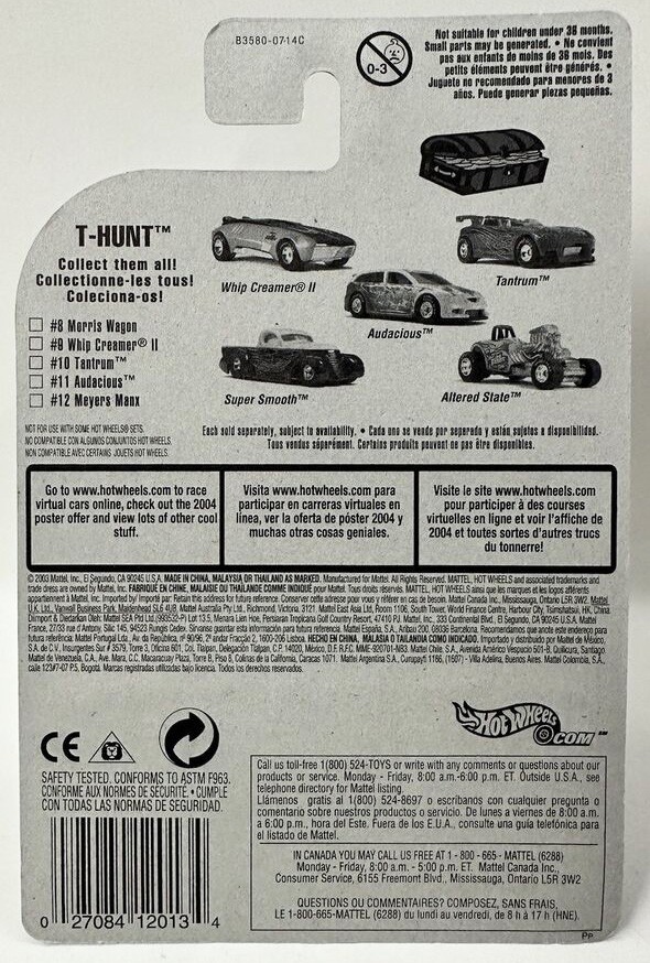 PART NUMBER: B3580 HOT WHEELS #: 111 TYPE: Mainline NAME: Audacious COLOR: Pearl White SERIES NAME: T-Hunt SERIES #: 11 |