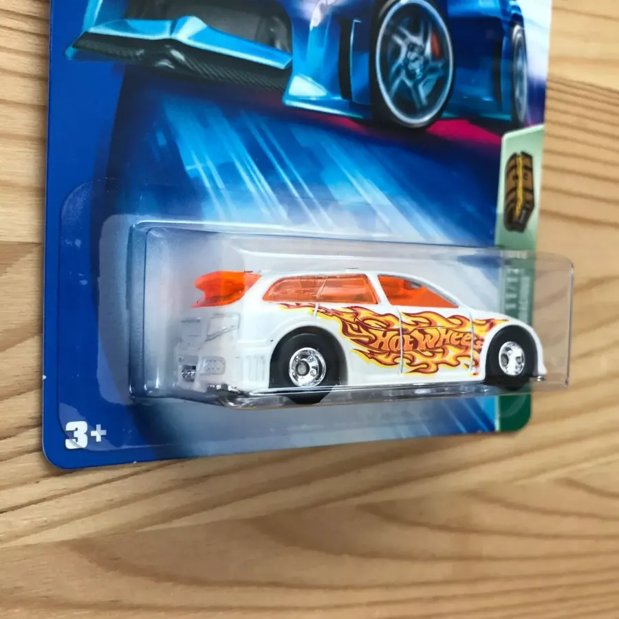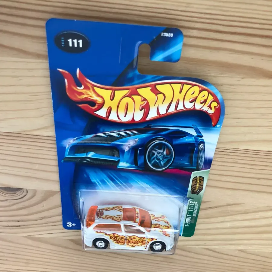 Collector Number: It has collector number 111. Identification: The car is white in color. It is decorated with red, orange and yellow flames. "Hot Wheels" are found on the sides of the car and a Treasure Hunt emblem on the top. It features an orange-tinted windshield, a tan interior and a chrome plastic base. The car has Real Rider wheels with deep dish rims.