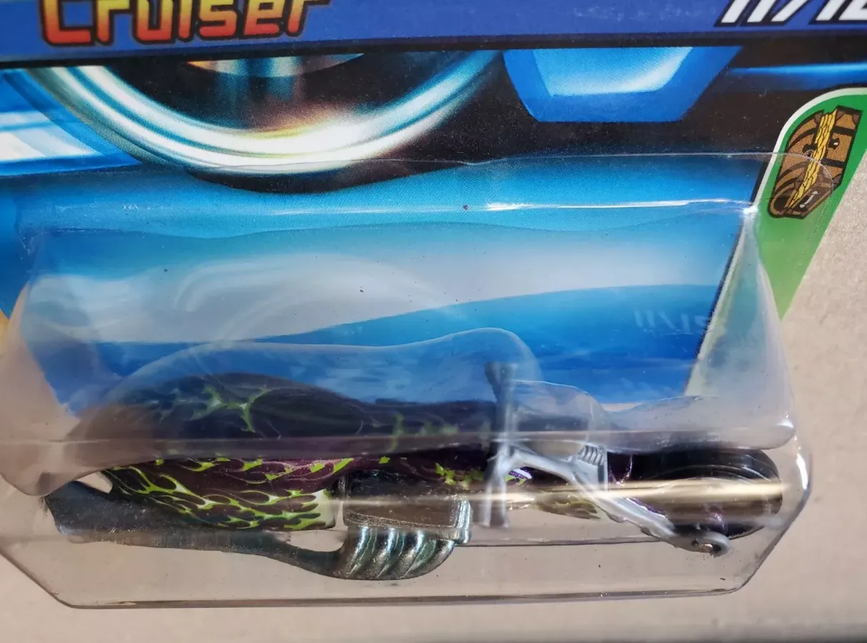 The bike is Metalflake purple in color. It is decorated green and white flames. A Treasure Hunt emblem is also found on the sides of the bike. It features grey handle bars and fork and an unpainted metal base.