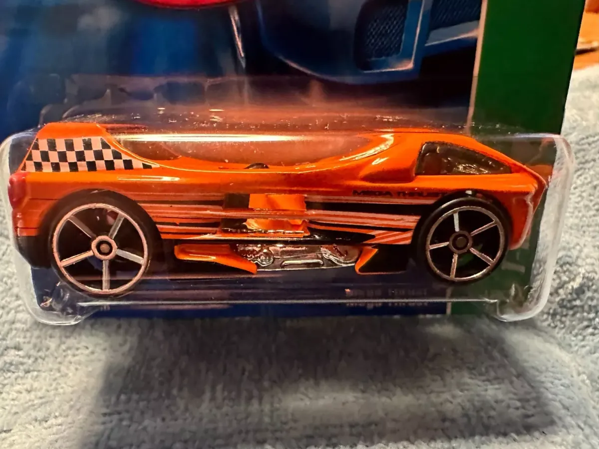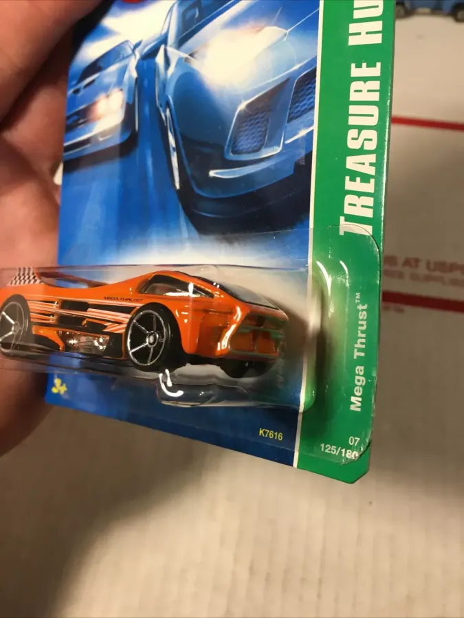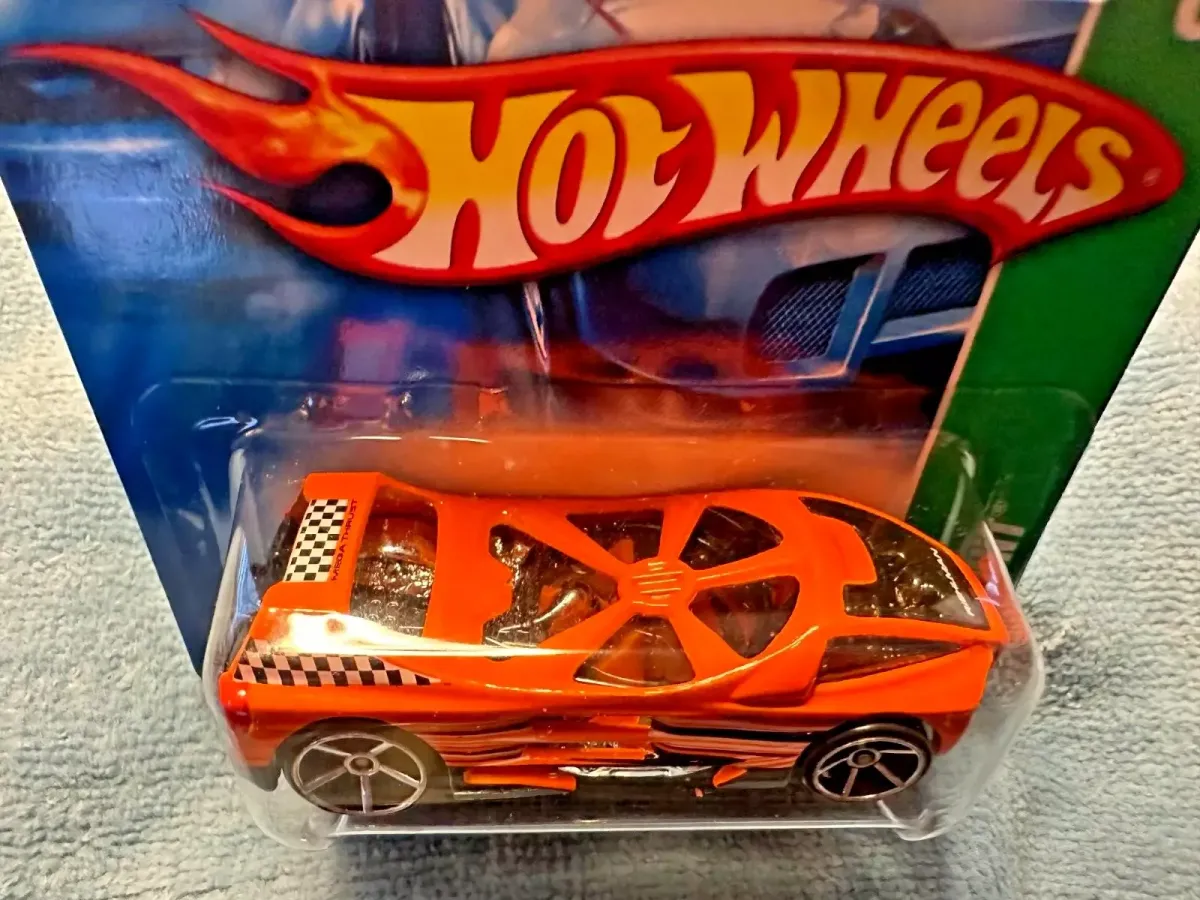 The car is orange in color. It is decorated with black and white checkered graphics on the spoiler. Black and white graphics and "MEGA THRUST" is displayed on the sides of the car. It features tinted windows, a chrome interior and a black plastic base. The car comes with Open-Hole 5-spoke wheels.