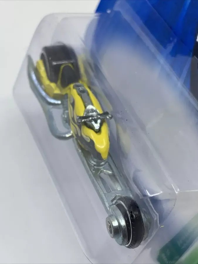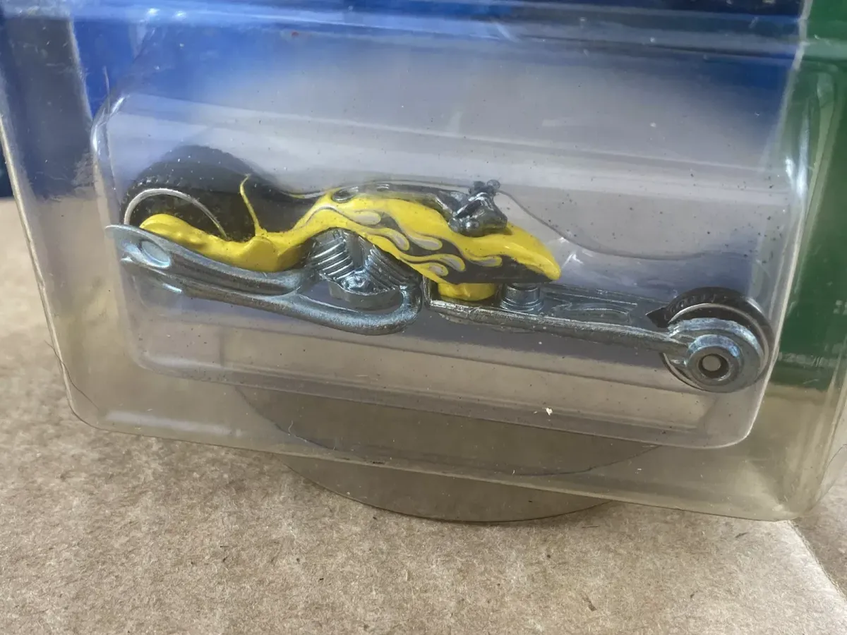 Identification: The cycle is yellow in color. The cycle is decorated with black, white and yellow flames. It features a black seat and an unpainted metal base. The cycle comes with MC5 wheels.