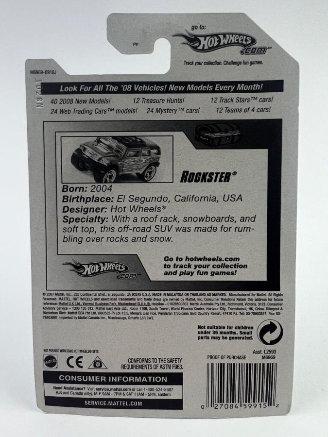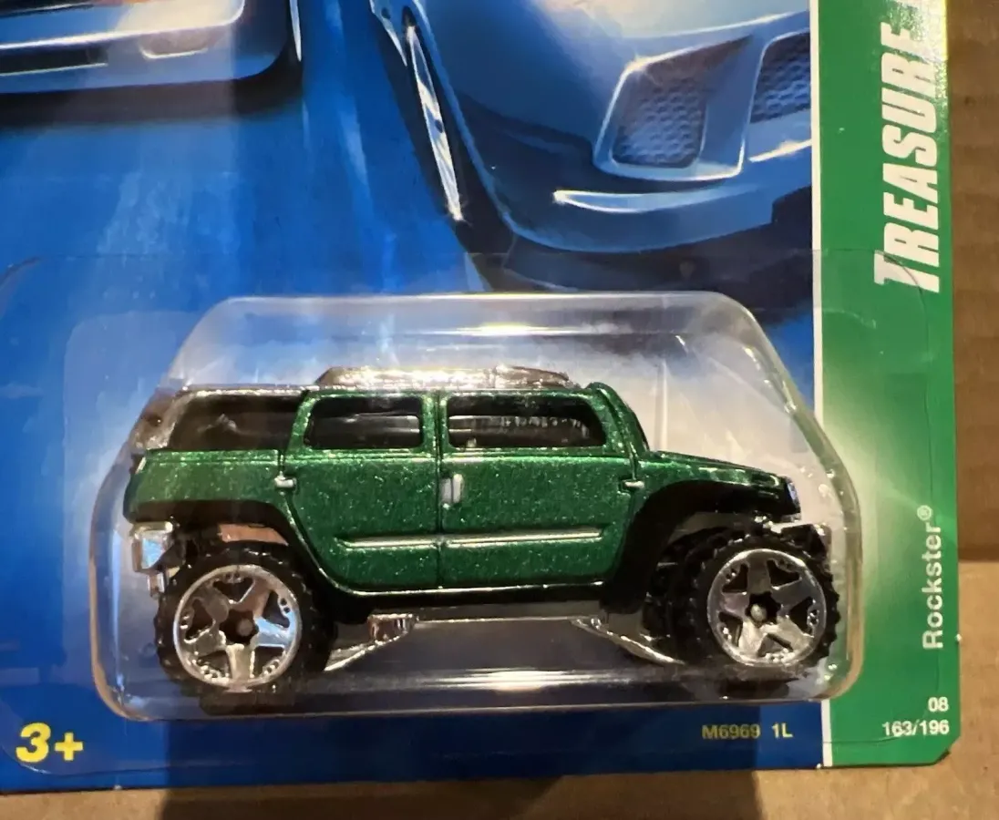 PART NUMBER: M6969 HOT WHEELS #: 163 TYPE: Mainline NAME: Rockster COLOR: Metalflake Green SERIES NAME: Treasure Hunt SERIES #: 3 |