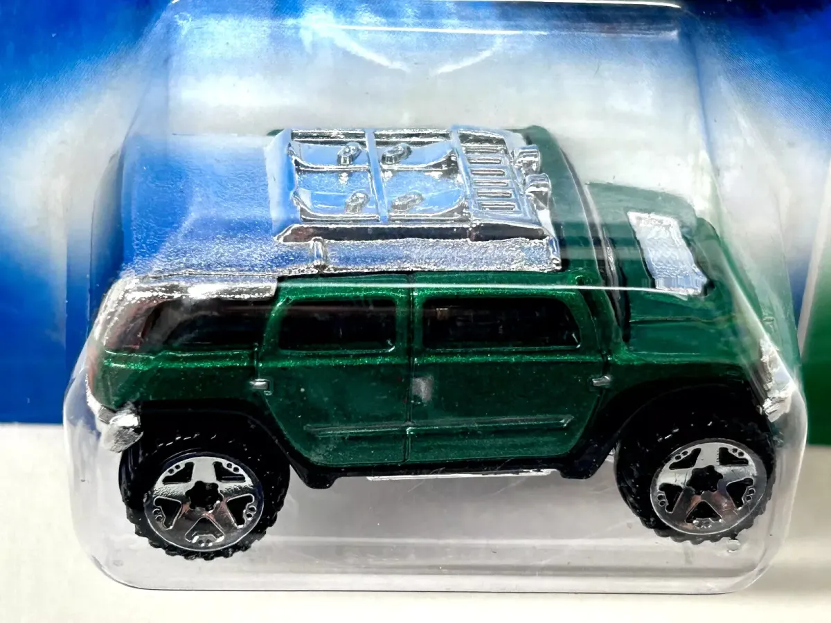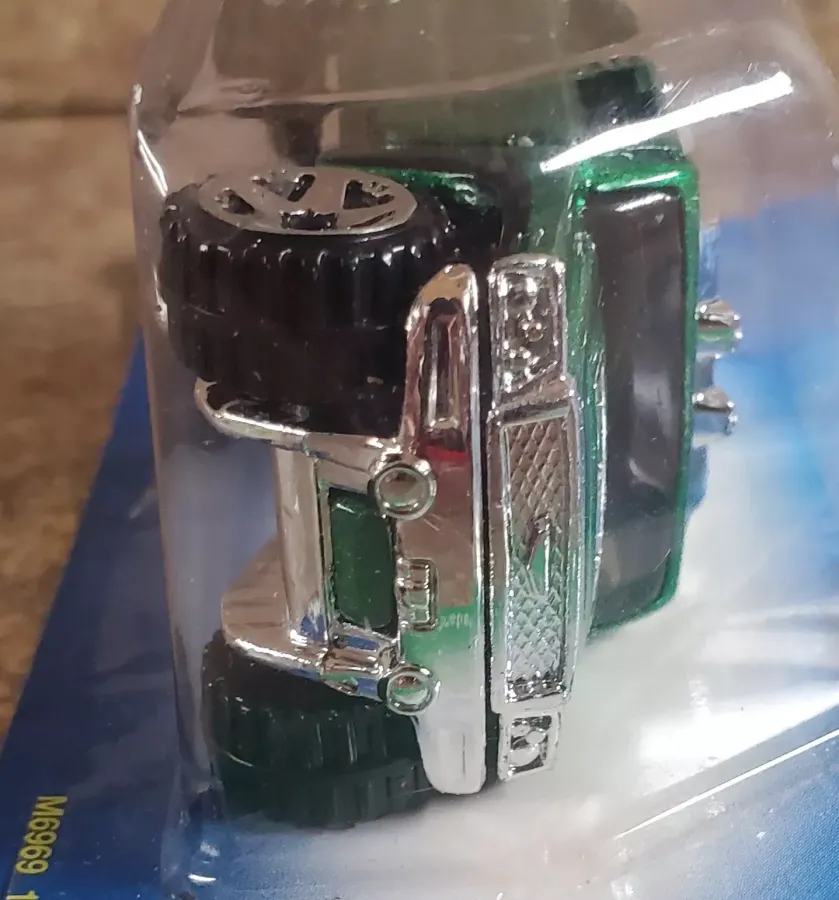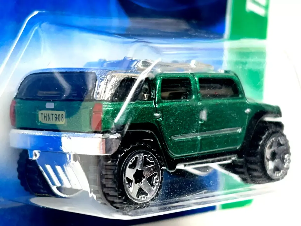 Identification: The car is Metalflake green in color. The car is decorated with silver trim on the sides, and a “THNTR08” license plate. It features tinted windows, a chrome interior and a chrome plastic base. The car has off-road 5-spoke wheels.