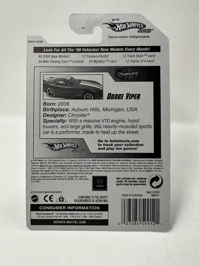 PART NUMBER: M6974 HOT WHEELS #: 168 TYPE: Mainline NAME: Dodge Viper COLOR: Orange SERIES NAME: Treasure Hunt SERIES #: 8 |