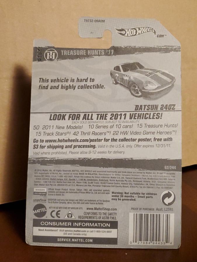 PART NUMBER: T9732 HOT WHEELS #: 62 TYPE: Mainline NAME: Datsun 240Z COLOR: Red / White SERIES NAME: Treasure Hunts SERIES #: 12 DATE CODE: D19 CASE: M |