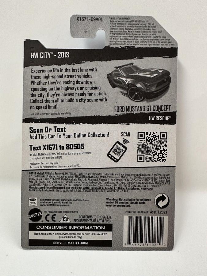 PART NUMBER: X1671 HOT WHEELS #: 14 TYPE: Mainline NAME: Ford Mustang GT Concept COLOR: Blue SERIES NAME: HW City SERIES #: 4 DATE CODE: CASE: L |