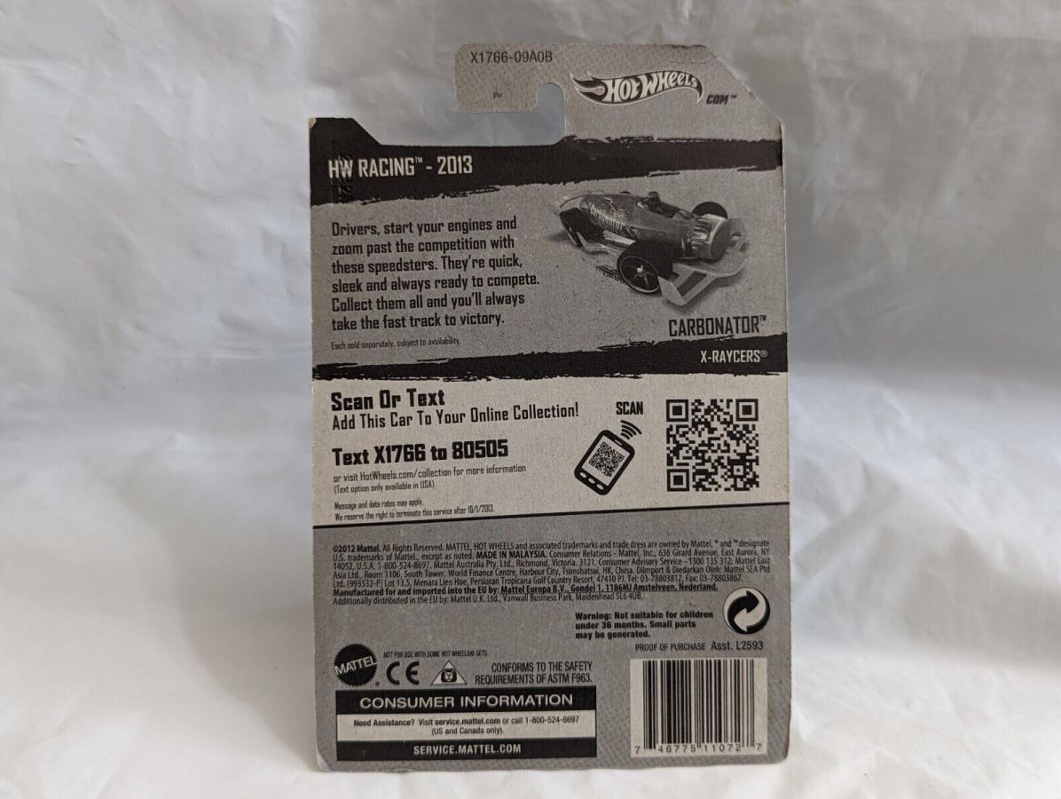 PART NUMBER: X1766 HOT WHEELS #: 136 TYPE: Mainline NAME: Carbonator COLOR: Clear Blue SERIES NAME: HW Racing SERIES #: 6 DATE CODE: CASE: B |