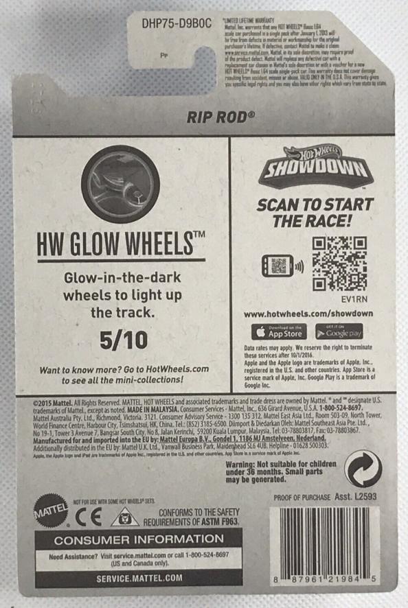 PART NUMBER: DHP75 HOT WHEELS #: 50 TYPE: Mainline NAME: Rip Rod COLOR: Black SERIES NAME: HW Glow SERIES #: 5 DATE CODE: CASE: C |