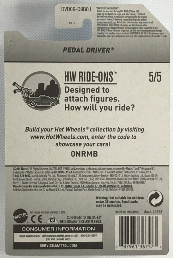 PART NUMBER: DVD09 HOT WHEELS #: No # TYPE: Mainline NAME: Pedal Driver COLOR: Blue SERIES NAME: HW Ride-Ons SERIES #: 5 DATE CODE: CASE: J |