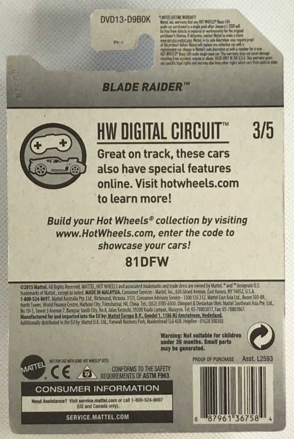 PART NUMBER: DVD13 HOT WHEELS #: No # TYPE: Mainline NAME: Blade Raider COLOR: Red SERIES NAME: HW Digital Circuit SERIES #: 3 DATE CODE: CASE: K |