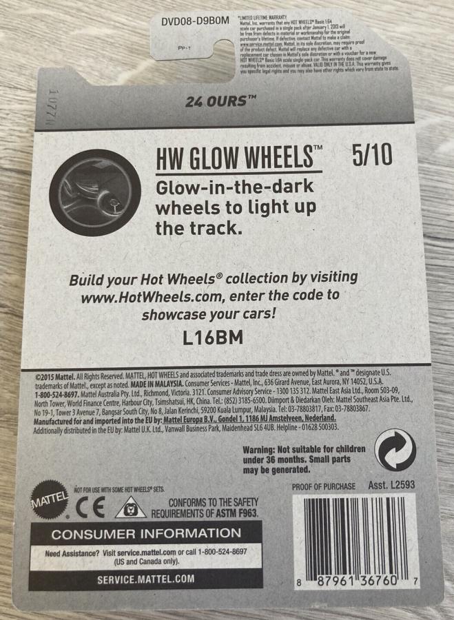 PART NUMBER: DVD08 HOT WHEELS #: No # TYPE: Mainline NAME: 24 Ours COLOR: Metal Flake Orange SERIES NAME: HW Glow Wheels SERIES #: 5 DATE CODE: CASE: M |