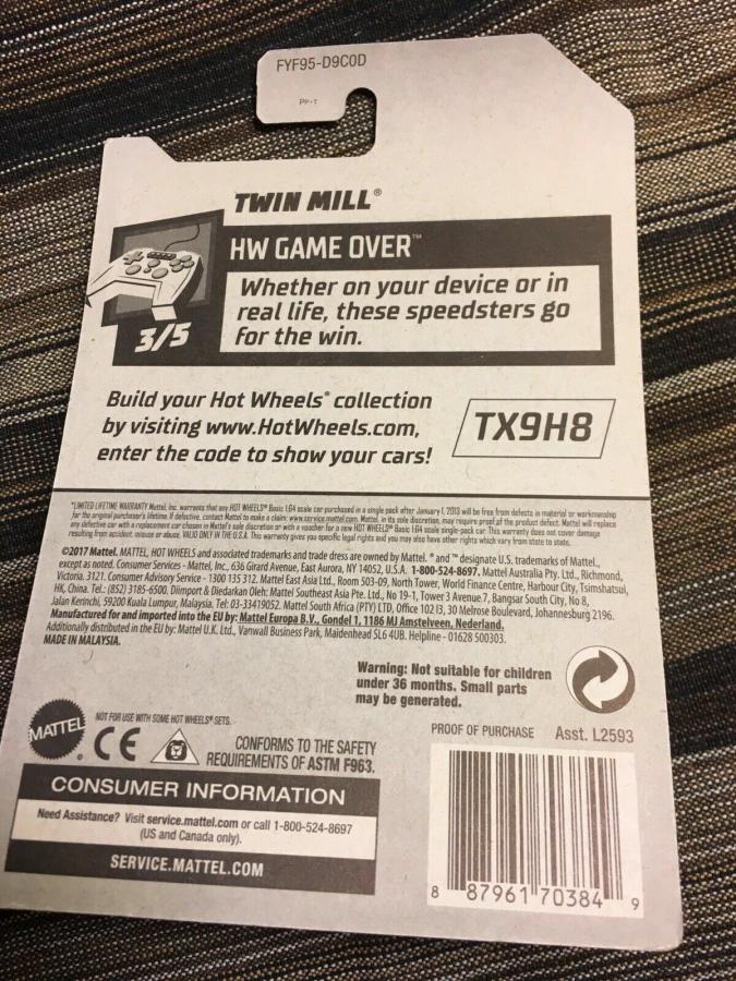 PART NUMBER: FYF95 HOT WHEELS #: 93 TYPE: Mainline NAME: Twin Mill COLOR: Satin Gold SERIES NAME: HW Game Over SERIES #: 3 DATE CODE: CASE: |